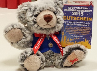 Zur Weihnachtszeit ist auch wieder die Bärensaison eröffnet: Gegen eine Spende von mindestens 6,00 EUR werden die beliebten AIDS-Solidaritätsbärchen am Weihnachtsmarktstand und in der Beratungs- und Geschäftsstelle der AIDS-Hilfe Stuttgart e.V. abgegeben. Der Bär ist ganze 15 Zentimeter groß, trägt das Öko-CE Zeichen und ist aus umweltfreundlichem, kuscheligem Material hergestellt. Seit 1999 erinnert der AIDS-Teddy zum Welt-AIDS-Tag daran, dass die von HIV und AIDS betroffenen Menschen auch weiterhin unsere Solidarität brauchen. Sammler aufgepasst: Neben dem Teddy 2015 gibt es dann auch noch Restbestände der Teddys 2014 und 2013 aus der beliebten Reihe!