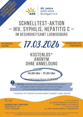 Die AIDS-Hilfe Stuttgart e.V. und das Gesundheitsamt Ludwigsburg bieten deshalb für alle, die sich auf HIV, Syphilis und/oder Hepatitis C testen lassen wollen, eine